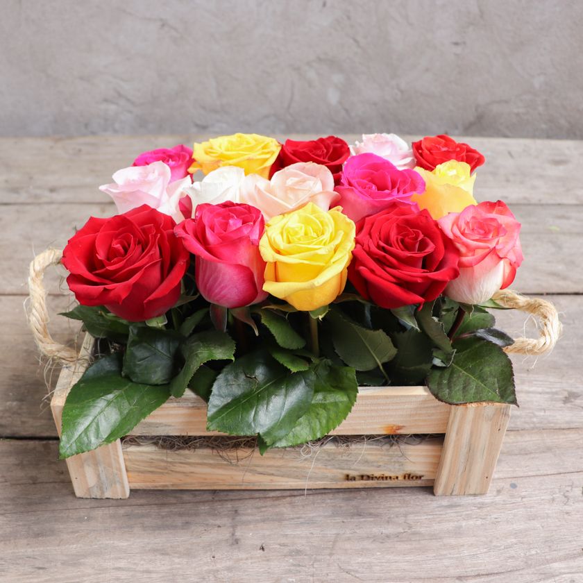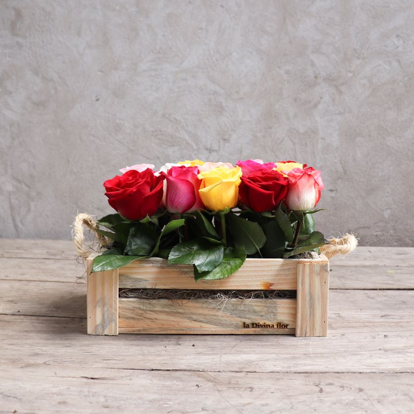 Caja de madera de pino con rosas coloridas