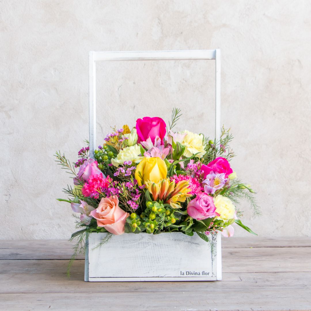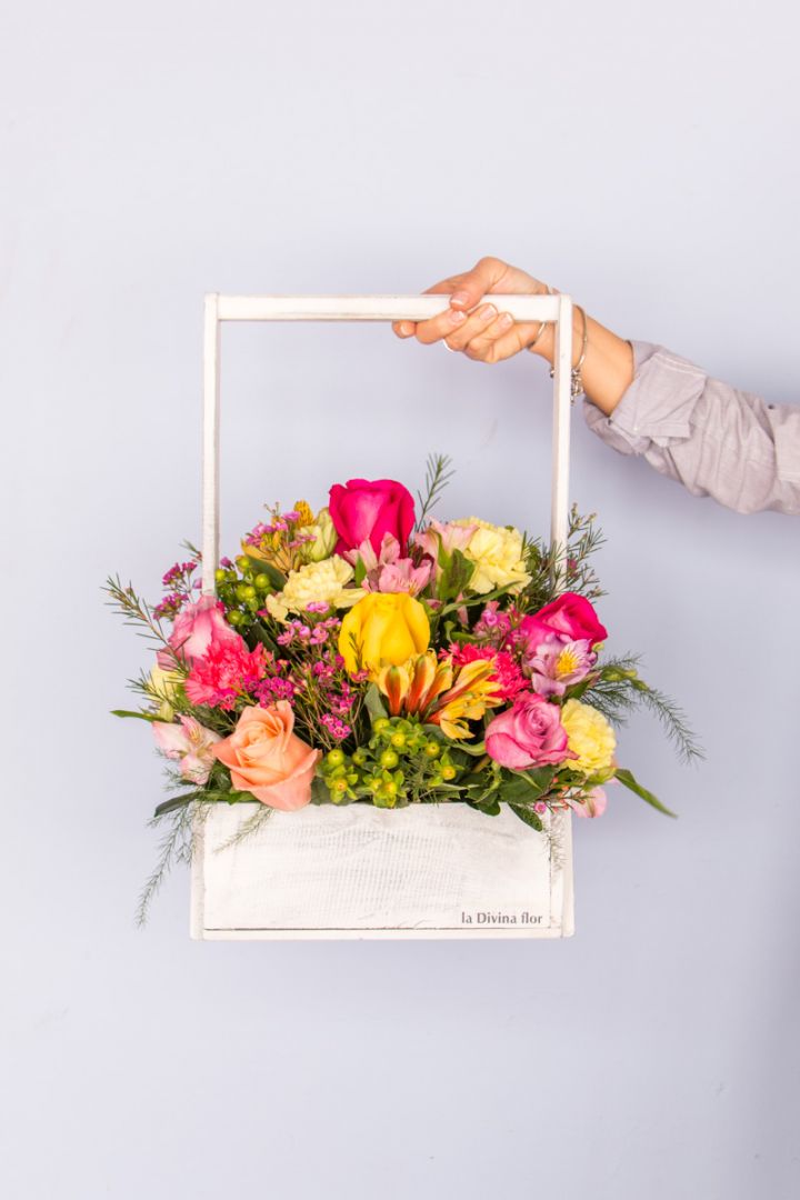 Canasta rústica con flores coloridas