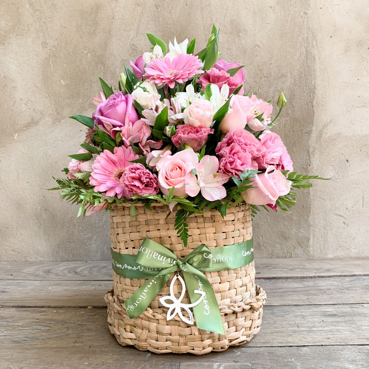 CANASTO CON AMOR CON FLORES COLORIDAS TONOS SUAVES